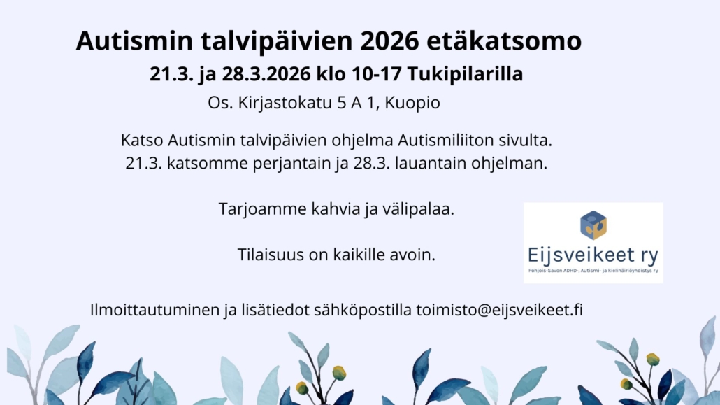 Autismin talvipäivien 2026 etäkatsomo 21.3. ja 28.3.2026 klo 10-17 Tukipilarilla