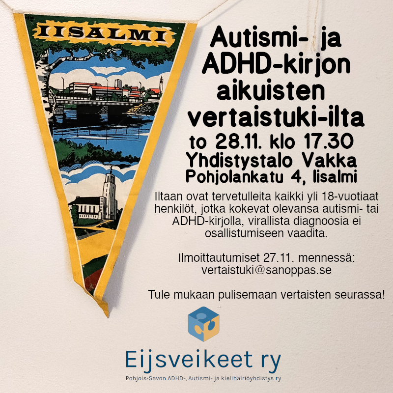 eijsveikeet2024-11-10 06:00:412024-11-05 17:44:50Iisalmi: Autismi- ja ADHD-aikuisten vertaistuki-ilta 28.11.2024